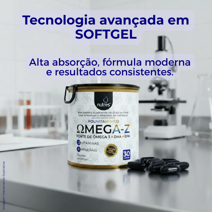 Nutres ÔmegA-Z combina 21 vitaminas e minerais com Ômega 3 de alta pureza. Cuida do coração, melhora a memória e fortalece o sistema imunológico, tudo em cápsulas moles de fácil ingestão.